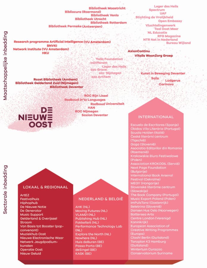 In meerdere sectoren en disciplines heeft De Nieuwe Oost een verbindende functie. We jagen samenwerkingen en nieuwe netwerken aan. Dit houdt in dat we samenwerken op basis van gedeelde artistieke visies, doelstellingen en uitgangspunten.